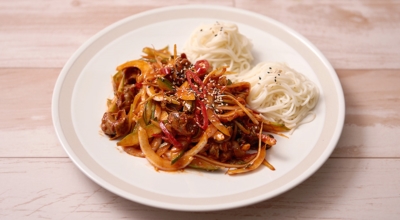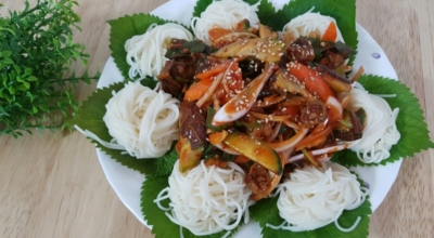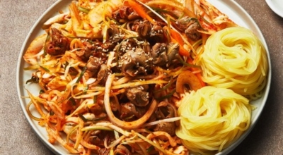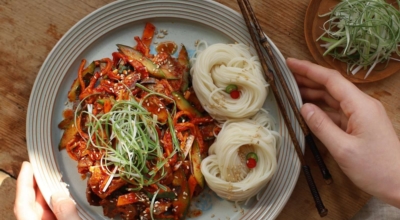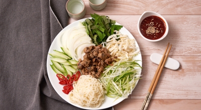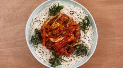 참기름, 깨소금 2 큰 술을 넣고 섞어줍니다. 입맛에 따라 소면까지 더하면 완벽하겠죠? 한 입 크기로 손질한 골뱅이 1캔, 손질한 당근 30g·오이 1개·대파 2대, 헹군 후 물기 짠 진미채 60g을 넣습니다. 손질한 재료에 여름 매콤장 5 큰 술, 2배 식초·참기름·깨 각 2 큰 술을 넣어 무쳐서 완성합니다.