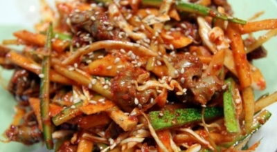 재료 : 골뱅이 통조림 1캔, 당근 30g(1/3개), 오이 하나, 대파 2대, 진미채 60g, 여름 매콤장 5 큰 술, 2배 식초 2 큰 술, 참기름 2 큰 술, 깨 2 큰 술