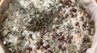 쑥이 쌀가루에 잘 버무려졌다면 준비해 놓은 병아리콩과 잣, 크랜베리를 모두 넣고 골고루 잘 섞어주어요.