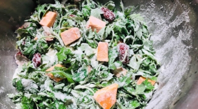 3. 깨끗하게 세척한 쑥에 꿀을 넣어 준비해 두었던 쌀가루를 넣고 골고루 버무려 주어요. 이 경우에 쑥이 너무 물기가 없이 마르면 안 돼요. 살짝 물기가 있어야 쌀가루가 쑥 표면에 잘 밀착이 되어요.