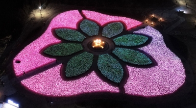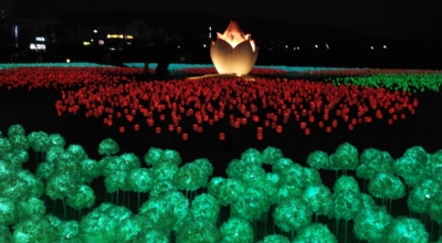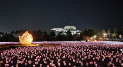 한 겨울에도 시들지 않는 꽃, LED 꽃의 정원이 경주 도심 속 공원인 황성공원에 마련됐어요. 지난 2020년 연말에 개장한 빛누리 정원은 경주의 새로운 야경 명소로 자리매김했답니다. 한국수력원자력의 후원으로 조성한 약 1,500평 규모의 빛누리 정원에 는 2만여 송이의 LED수국과 장미가 가득 보완되어져 있습니다. 중앙의 연꽃 조형물을 중점으로 꽃송이가 꽃망울을 틔우듯 LED꽃들이 사방으로 피어나게됩니다.