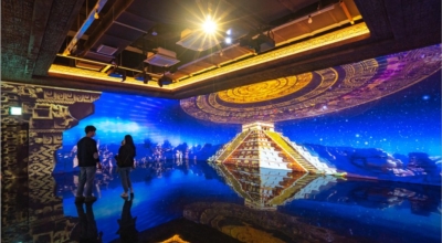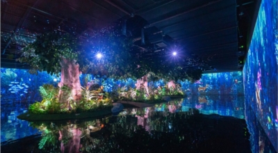 처음 만나는 공간은 ‘재규어의 숲’입니다. 거대한 나무와 열대 숲이 조성되어 있다고 하며 사면의 벽을 메운 브라운관에서 화려한 색채의 자연과 신비로운 동물들이 등장하는 미디어 아트가 약 8분 48초간 펼쳐져요. 이어서 깊은 숲속 버려진 ‘신전’으로 향해 고대 문명의 태동을 역동적인 영상으로 만나게됩니다. 6분의 신전 미디어 아트가 끝나면 바다 속으로 떠나게됩니다.