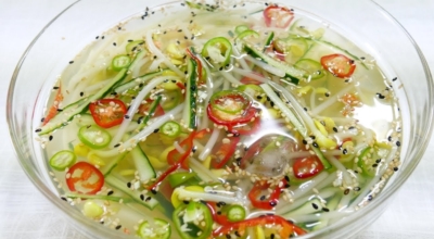 재료 : 백오이 2개, 홍고추 한 개, 청양고추 한 개, 양파 1/2개, 국간장 4스푼, 멸치액젓 2스푼, 마늘 2개(다지기), 설탕 2스푼, 식초 1/4컵, 통깨 1스푼, 매실액 2스푼, 생수 1리터, 레몬 1/2개, 소금 1스푼