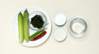 기본 재료 : 오이 1/2개, 굵은 소금 1줌, 양파 1/4개, 물기 짠 불린 미역 1컵, 국간장 1작은술, 설탕 2 큰술, 다진 마늘 1작은술, 통깨 약간